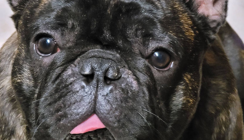 If you're up, he's up. If you're working, he's playing; if you're watching tv, he's playing; if you're eating, he's playing if you're about to go to sleep, he's playing. This guy got enough energy to power a whole city. His favorite pastime is to torment his two favorite victims, Caesar and Olga. They can run, but they can't hide from this high-energy Frenchie. He loves to grab cartilage and have a chew. Arms, legs, ears, noses, it doesn't matter; if it's in plain view, then it's free game. There is no rest for those who grab this spunky kid's attention, whether it's a doggo or a humie. What about your personal space? It's not yours anymore when this mini-Rhino goes on the prowl for attention and treats. He gets what he wants.